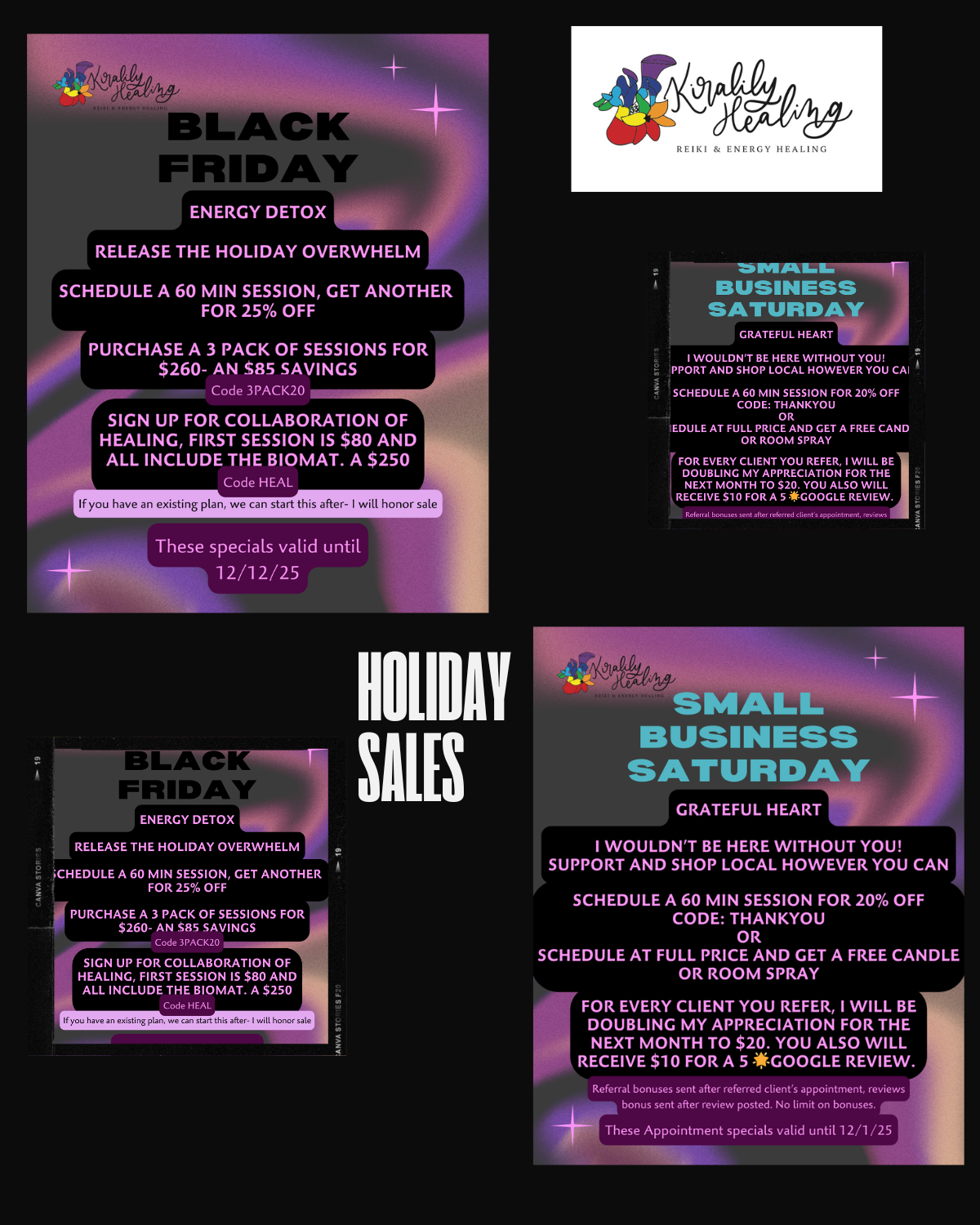 Starting on Friday, 11/28, take advantage of these deals on my scheduling page! Don't forget about Small Business Saturday and to Shop Small for all your holiday gifts!